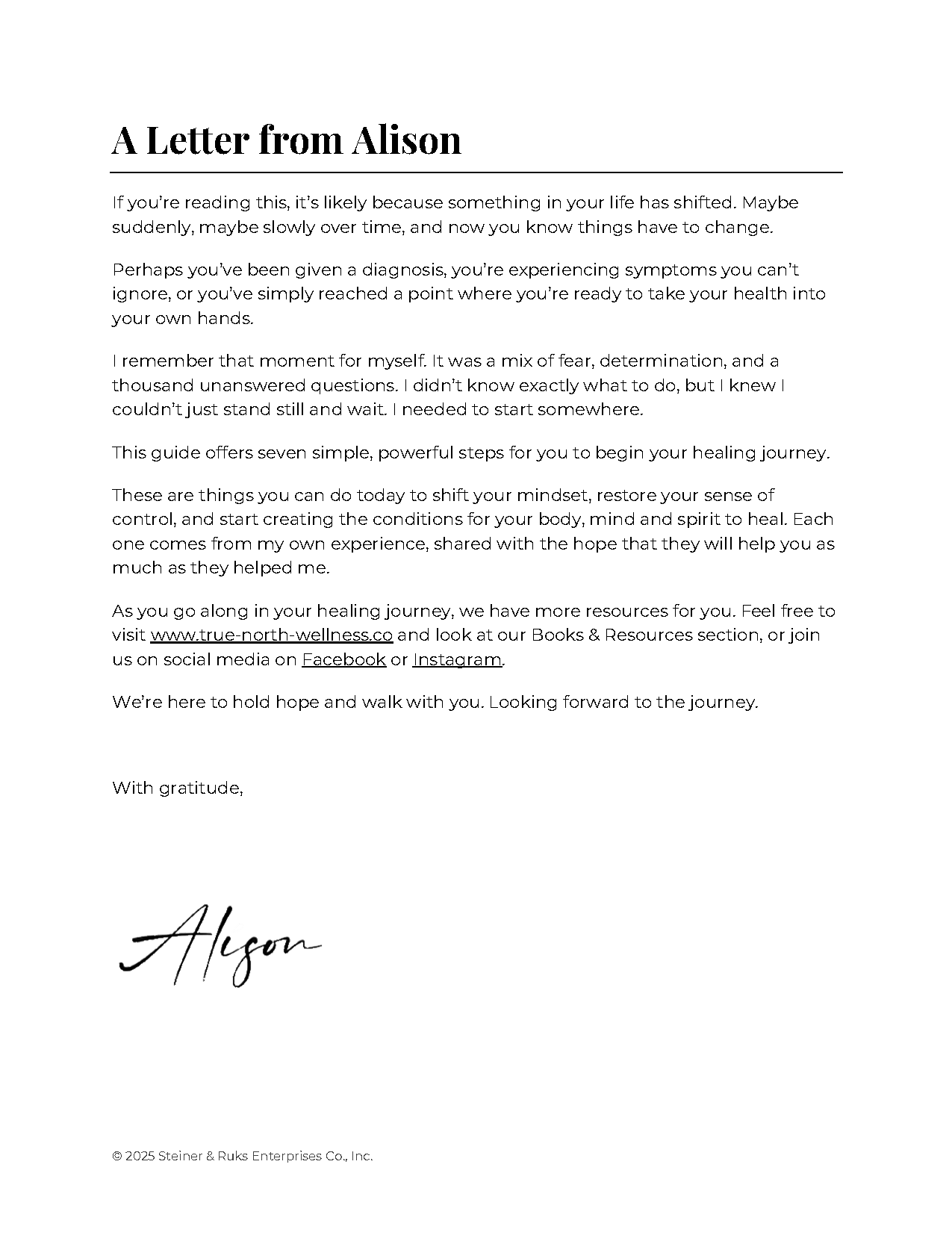 Everything was written by True North Wellness Co. founder, Alison Ruks. who despite an incurable disease diagnosis, fully healed outside the conventional system. To learn more about Alison, visit our About page.